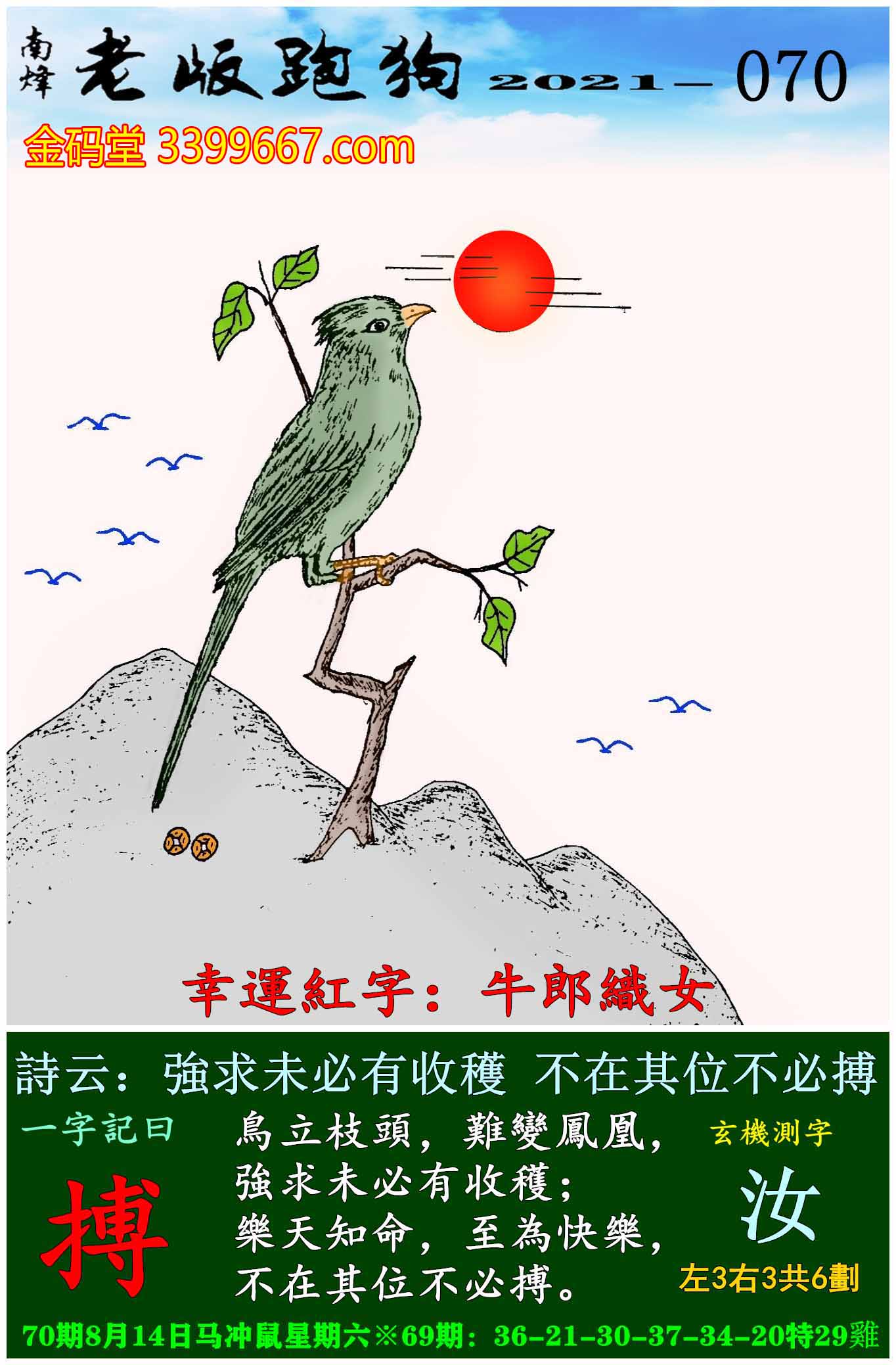 070期老版跑狗一字記之曰:【搏】玄機測字:《汝》