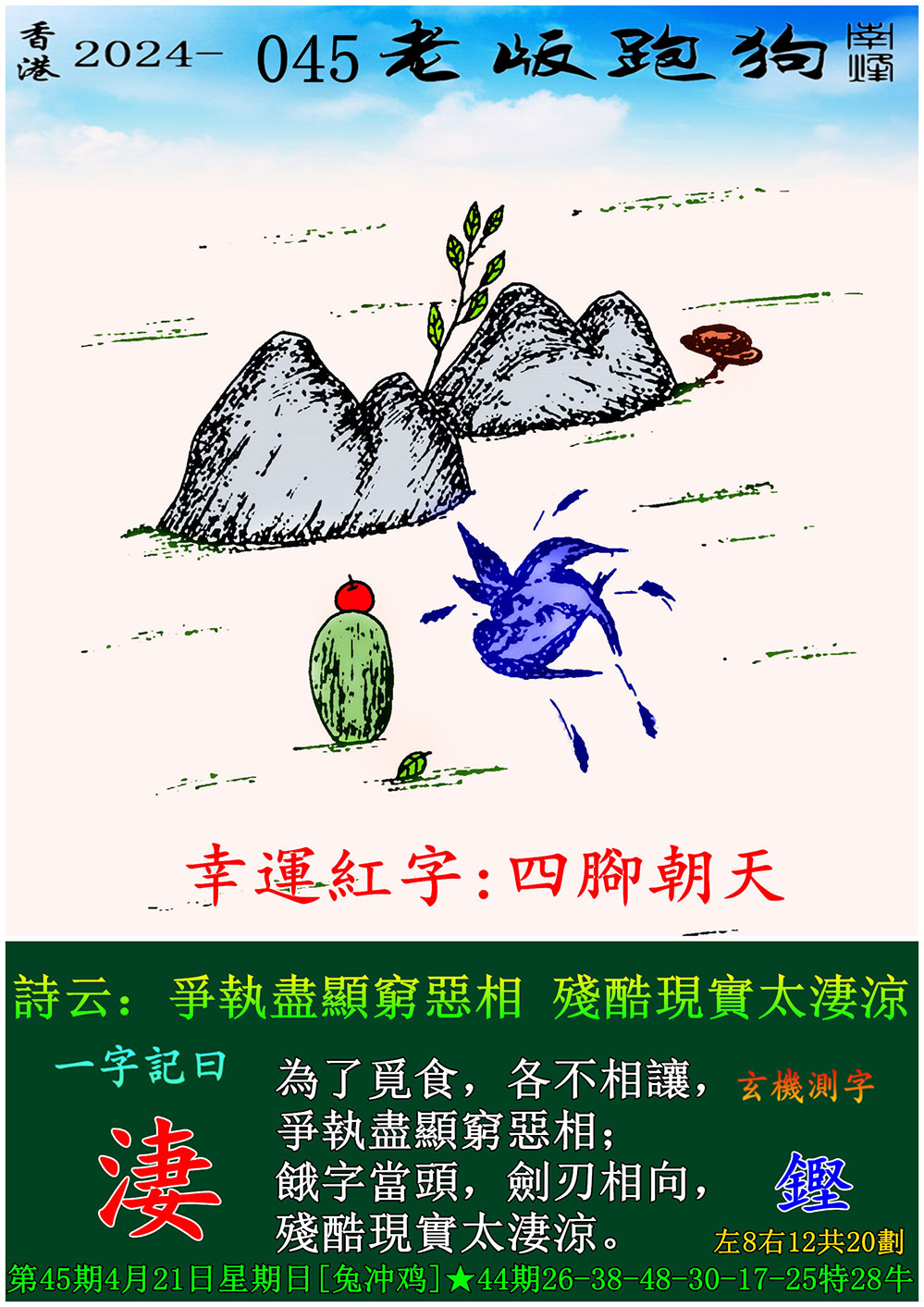 主题 : 045期老版跑狗一字記之曰:【淒】 玄機測字:《鏗》