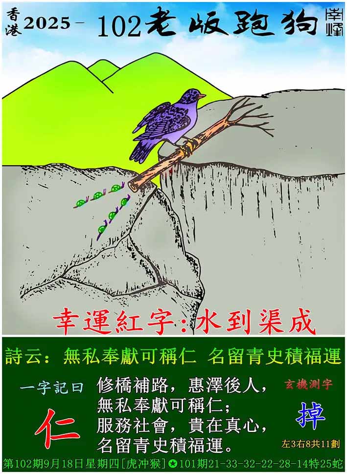 102期老版跑狗一字記之曰:【仁】 玄機測字:《掉》