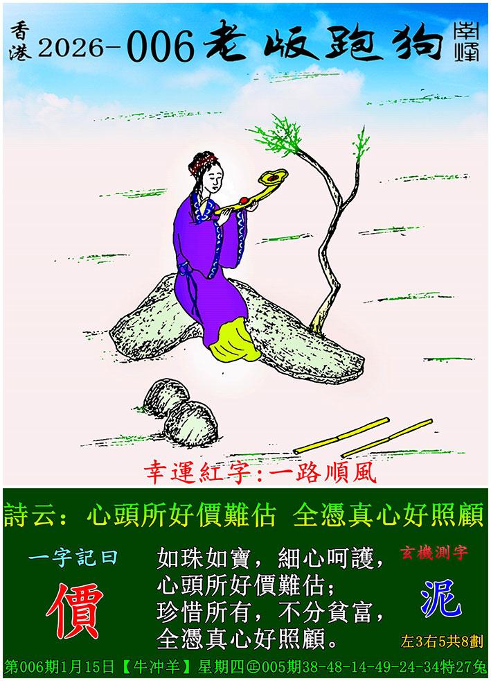 006期老版跑狗一字記之曰:【價】 詩雲:心頭所好價難估,全憑真