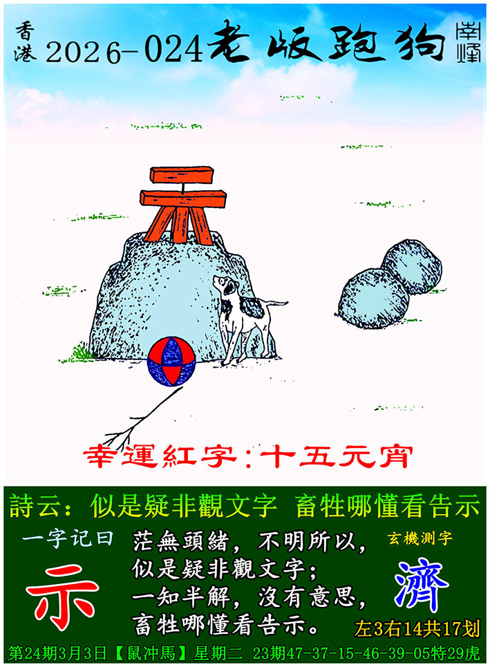 主题 : 024期老版跑狗一字記之曰:【示】 玄機測字:《濟》