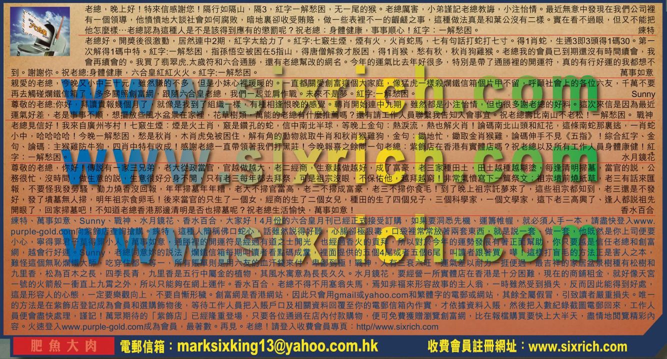 →〖Sunny〗老總同意妳的說法,爛鐵信箱每期叫讀者看點碼成糞,裡面提供的五個4尾或者五個6尾,叫讀者跟著買,嘩!這樣打盲毛的方法正是害人之本,難怪這個無恥鐵大師,吃穿住 都一等一,所有賬單則是用六友的血汗錢來付,卑鄙到極!
