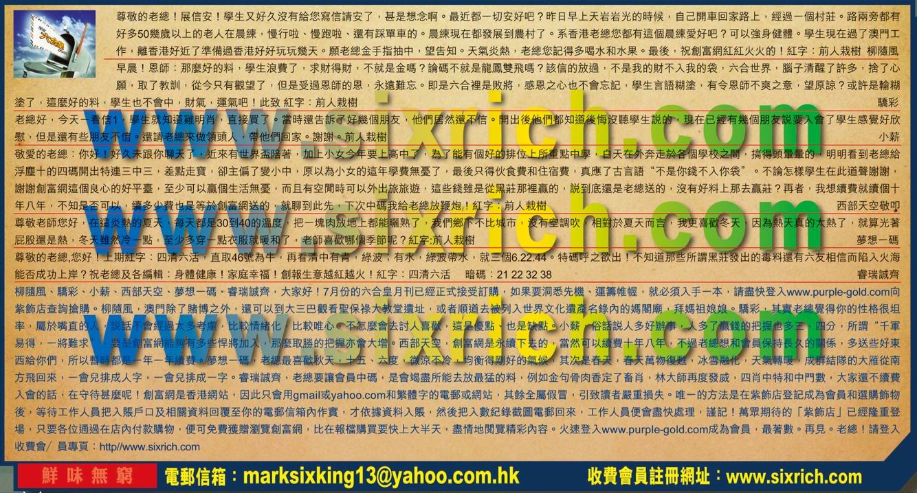 【4】敬愛的老總:你好!好久未跟你聊天了,近來有世界盃陪著,加上小女今年要上高中了, 為了能有個好的排位上所重點中學,白天在外奔走於各個學校之間,搞得頭暈暈的,明明看到老總給浮塵十的四碼開出特連三中三,差點走寶,卻主偏了變小中,原以為小女的這年學費無憂了,最後只得伙食費和住宿費,真應了古言語“不是你錢不入你袋”。不論怎樣學生在此道聲謝謝,謝謝創富網這個良心的好平臺,至少可以贏個生活無憂,而且有空閒時可以外出旅旅遊,這些錢雖是從黑莊那裡贏的,說到底還是老總送的,沒有好料上那去贏莊?再者,我想續費就續個十年八年,不知是否可以,續多少費也等於創富網送的,就聊到此先 ,下次中碼我給老總放鞭炮, 紅字:前人栽樹    ---西部天空敬叩