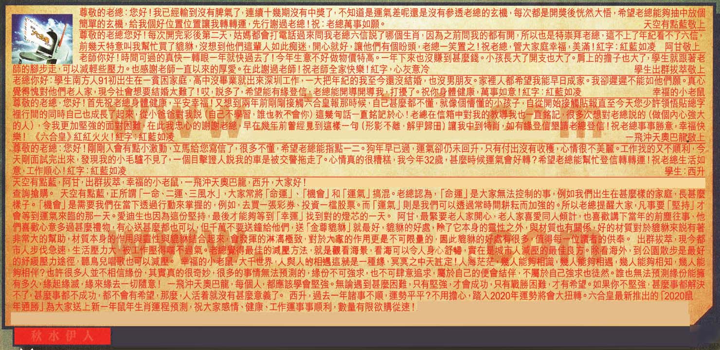 【3】老師你好!時間可過的真快一轉眼一年就快過去了!今年生意不好做物價特高。一年下來也沒賺到甚麼錢。小孩長大了開支也大了。肩上的擔子也大了,學生就跟著老師的腳步走可以減輕些壓力。也感謝老師一直以來的厚愛。在此謝過老師!祝老師全家快樂!紅字,心灰意冷------學生出群拔萃敬上