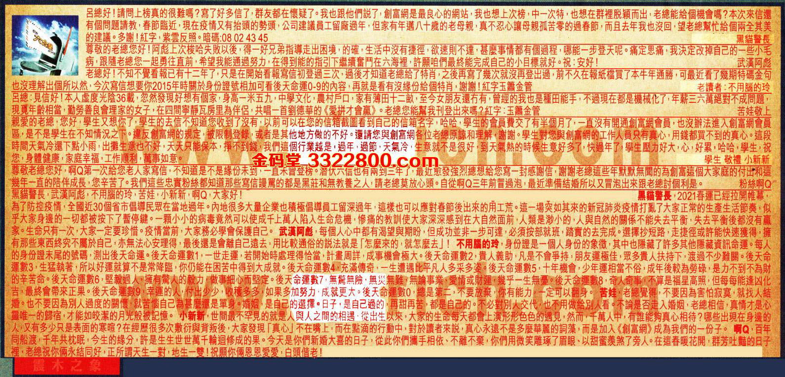 【1】.呂總好!請問上榜真的很難嗎?寫了好多信了,群友都在懷疑了。我也跟他們說了,創富網是最良心的網站,我也想上次榜,中一次特,也想在群裡脱穎而出;老總能給個機會嗎?本次來信還有個問題請教,春節臨近,現在疫情又有抬頭的勢頭,公司建議員工留廠過年,但家有年邁八十歲的老母親,真不忍心讓母親孤苦零的過春節,而且去年我也沒回,望老總幫忙給個兩全其美的建議o多谢!紅字,紫雲反照。暗碼:08 02 4345 黑貓警長