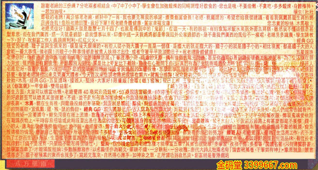 【6】.老總您好,我看六合皇六信二年了,您的文筆和淵博的知識令我佩服的五體投地,怎麼回事三報老總都學富五車,但是曾道人閉關他徒弟的回信像天文,沒人能猜到甚麼,希望老總請他出來見見廣大讀者。今天首次來信請老總把我排在第六。萬萬分感謝!祝老總壽比南山!福如東海!萬事如意!    學生堅持