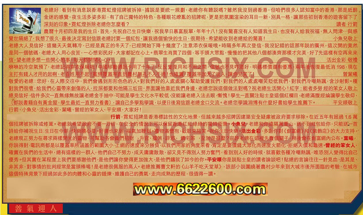 【1】.老總好:看到有消息說香港霓虹燈招牌被拆掉,據說是要統一規劃,老總你有聽說嗎?雖然我沒到過香港,但咱們很多人認知當中的香港,那是紙醉金迷的感覺,夜生活多姿多彩,有了自己獨特的特色,各種眼花繚亂的招牌呢,更是把氛圍渲染的耳目一新,別具一格,讓那些初到香港的遊客留下了深刻的印象。霓虹燈拆除老總你怎麼看? 讀者 行箭
