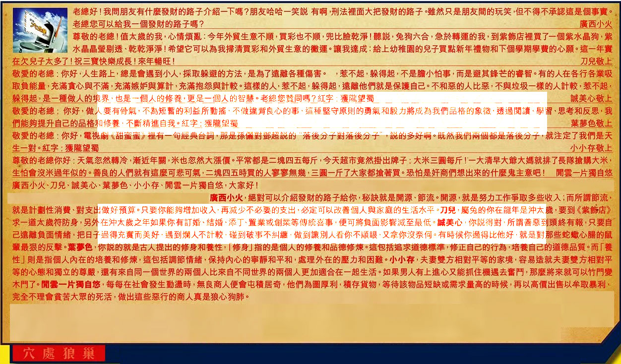【2】.尊敬的老總!值太歲的我,心情煩亂:今年外貿生意不順,買彩也不順,兜比臉乾淨!聽說,兔狗六合,急於轉運的我,到紫飾店裡買了一個紫水晶狗,紫水晶晶瑩剔透、乾乾淨淨!希望它可以為我掃清買彩和外貿生意的黴運。讓我達成:給上幼稚園的兒子買點新年禮物和下個學期學費的心願。這一年實在欠兒子太多了!祝三寶快樂成長!來年暢旺! 刀兒敬上