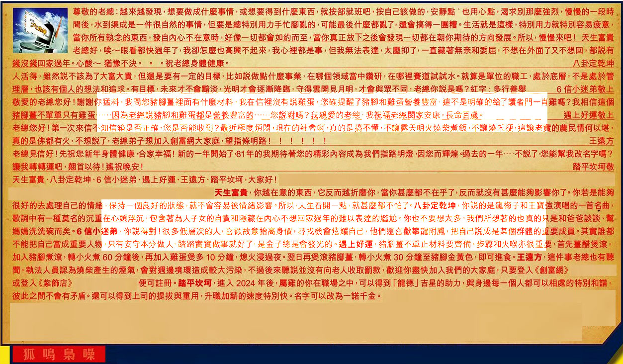 【2】.老總好,唉~眼看都快過年了,我卻怎麼也高興不起來,我心裡都是事,但我無法表達,太壓抑了,一直藏著無奈和委屈,不想在外面了又不想回,都說有錢沒錢回家過年。心酸~猶豫不決。。。祝老總身體健康。 八卦定乾坤