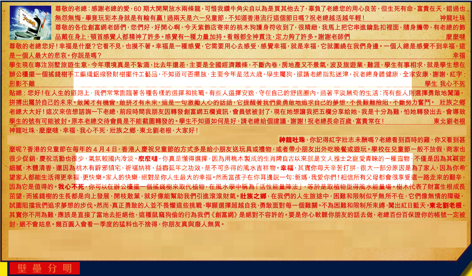【1】.尊敬的老總:感謝老總的愛,60 期大開閘放水兩條龍,可惜我鑽牛角尖自以為是買其他去了,辜負了老總您的用心良苦,但生死有命,富貴在天,錯過也無怨無悔,畢竟玩彩本身就是有輸有赢!過兩天是六一兒童節,不知道香港流行這個節日嗎?祝老總越活越年輕! 神龍吐珠
