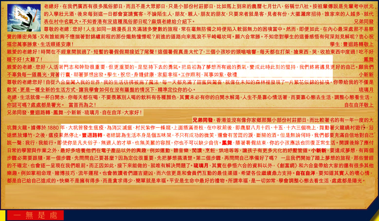 【5】.尊敬的老總您好!自從六合皇闖入我的世界,我的生活彷佛被施了魔法,每一天都充滿了甜蜜與驚喜,就像在未知的森林裡發現了一片繁花似錦的秘境。你帶給我的不僅是歡笑,更是一種全新的生活方式,讓我學會如何在沒有羅盤的情況下,精準定位你的心。 琉璃月