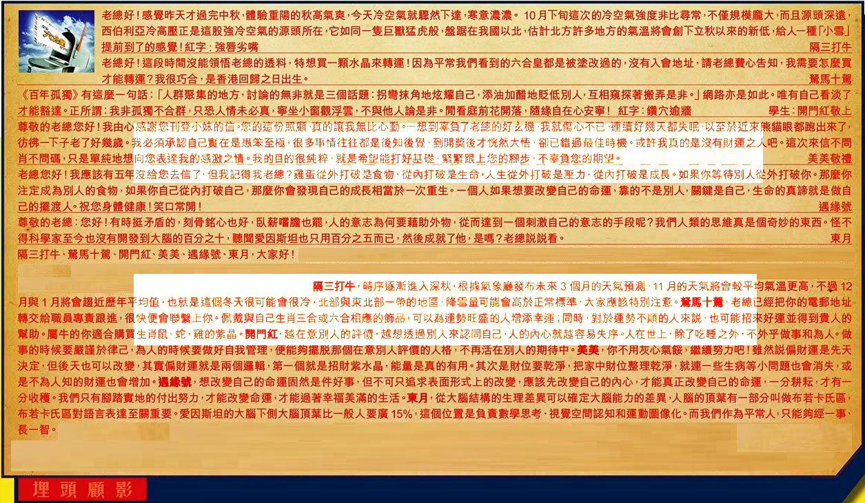 【4】.尊敬的老總您好!我由心感謝您刊登小妹的信。您的這份照顧,真的讓我無比心動。一想到辜負了老總的好玄機,我就傷心不已連續好幾天都失眠,以至於近來熊貓眼都跑出來了,彷佛一下子老了好幾歲。我必須承認自己實在是愚笨至極,很多事情往往都是後知後覚,到開獎後才恍然大悟,卻已錯過最佳時機。或許我真的是沒有財運之人吧。這次來信不問肖不問碼,只是單純地想向您表達我的感激之情。我的目的很純粹,就是希望能打好基礎,緊緊跟上您的腳步,不辜負您的期望。 美美敬禮