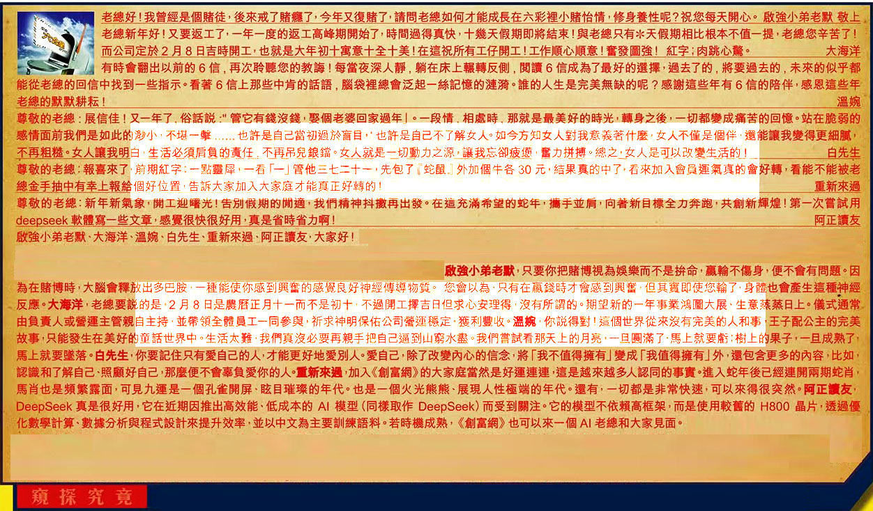 【6】.尊敬的老總:新年新氣象,開工迎曙光!告別假期的閒適,我們精神抖擻再出發。在這充滿希望的蛇年,攜手並肩,向著新目標全力奔跑,共創新輝煌!第一次嘗試用deepseek軟體寫一些文章,感覺很快很好用,真是省時省力啊! 阿正讀友