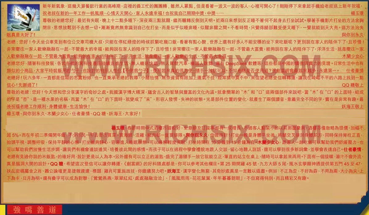 【5】.老總好!玩六多年,一直都是信箱的忠實粉絲,也一直秉承老總的教導,小賭怡情,無奈資質有限加上運氣不佳,經常猜中買不中,來信望老總登信轉轉運,讓我在崎嶇不平的六路上找到一點信心!先謝過了! QQ糖敬上