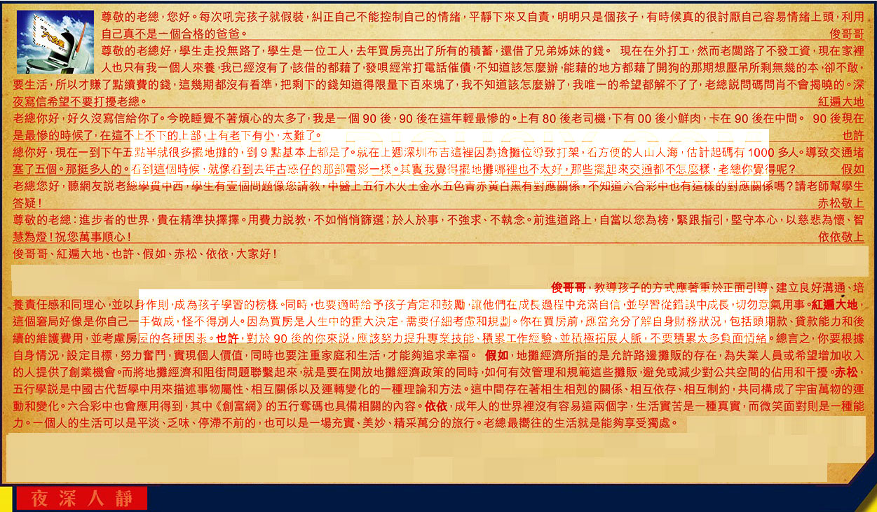 【3】.老總你好,好久沒寫信給你了。今晚睡覺不著煩心的太多了,我是一個90後,90後在這年輕最慘的。上有80後老司機,下有00後小鮮肉,卡在90後在中間。90後現在是最惨的時候了,在這不上不下的上部,上有老下有小,太難了。 也許