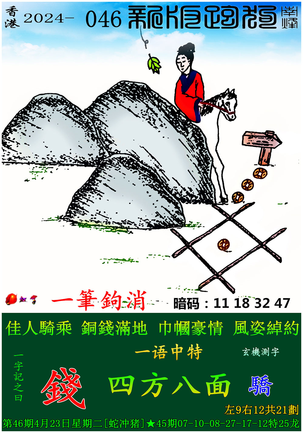 046期:新版跑狗一字記之曰【錢】 玄機測字:【驕】
