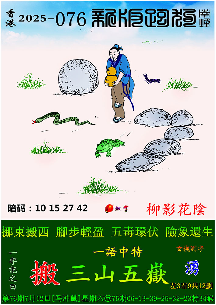 076期:新版跑狗一字記之曰【搬】 玄機測字:【湧】