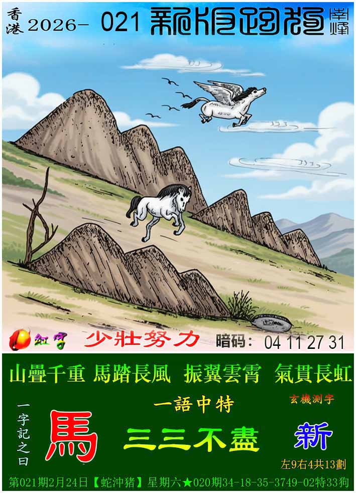 021期:新版跑狗一字記之曰【馬】 玄機測字:【新】